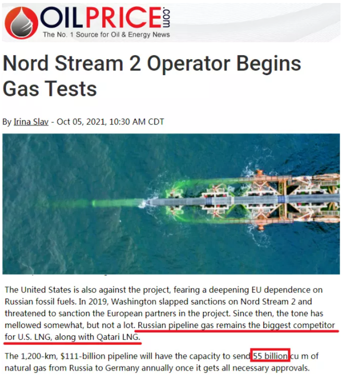 国际油价网站(OILPrice)在“北溪-2☆”管道建成并开始输气测试后曾发文介绍说,这条全长1200公里▼◆-、耗资110亿美元的管道一旦获得所有必要的批准,每年将有能力从俄罗斯向德国输送550亿立方米天然气-。报道同时提到,俄罗斯天然气是美国液化天然气的最大竞争对手。