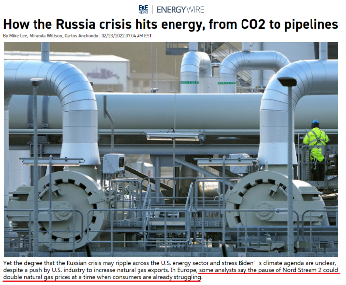 美国环境和能源新闻网(E&E)援引欧洲分析人士的线★•□”项目的暂停可能会使欧洲天然气价格翻番。