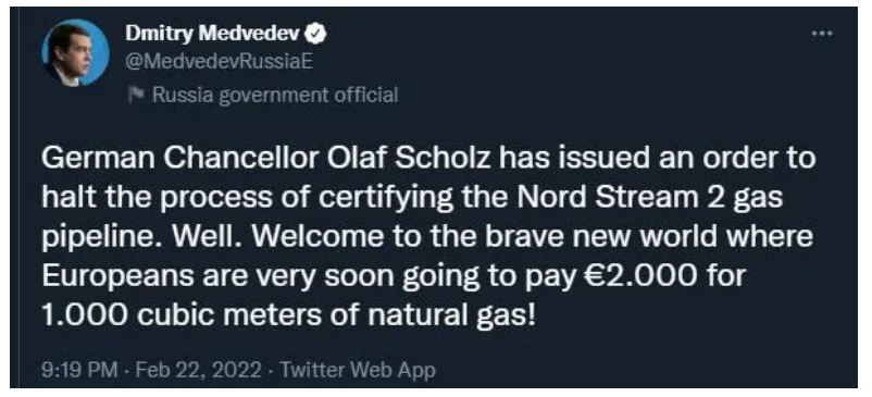 俄罗斯安全委员会副主席梅德韦杰夫在社交媒体上警告△…▼,“北溪-2▷”项目的受挫将导致欧洲天然气价格飙升至每千立方米2000欧元。