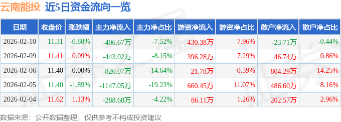 证券之星消息,截至2026年2月10日收盘,云南能投(002053)报收于11.31元,下跌0.88%,换手率0.52%,成交量4.76万手,成交额5404.72万元。